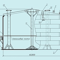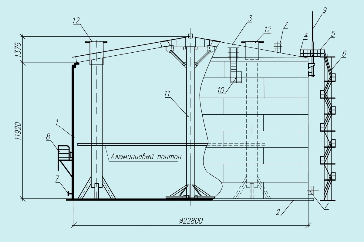 1-стенка, 2-крыша, 3-днище, 4-площадки и ограждения на крыше, 5-переход с шахтной лестницы на крышу, 6-шахтная лестница, 7-люки и патрубки, 8-площадка для осмотра понтона в 3-м поясе, 9-молниезащита, 10-площадка и стремянка парогенераторов, 11-центральная стойка, 12-направляющие понтона
