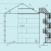 1- днище, 2 - стенка, 3 - крыша коническая самонесущая, 4 - люки и патрубки, 5 - люки и патрубки, 6 - площадка кольцевая, ограждение, 7 - лестница шахтная