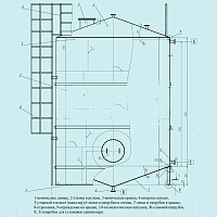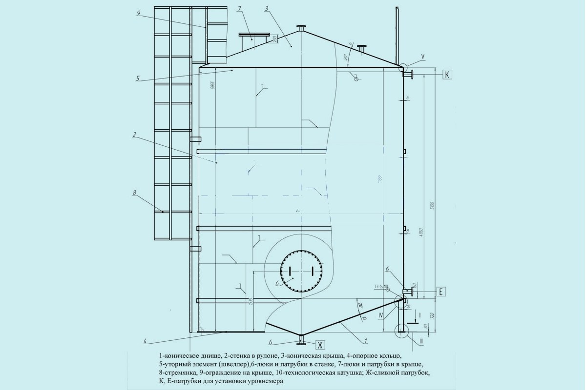 1-коническое днище, 2-стенка в рулоне, 3-коническая крыша, 4-опорное кольцо, 5-уторный элемент (швеллер),6-люки и патрубки в стенке, 7-люки и патрубки в крыше, 8-стремянка, 9-ограждение на крыше, 10-технологическая катушка; Ж-сливной патрубок, К, Е-патрубки для установки уровнемера